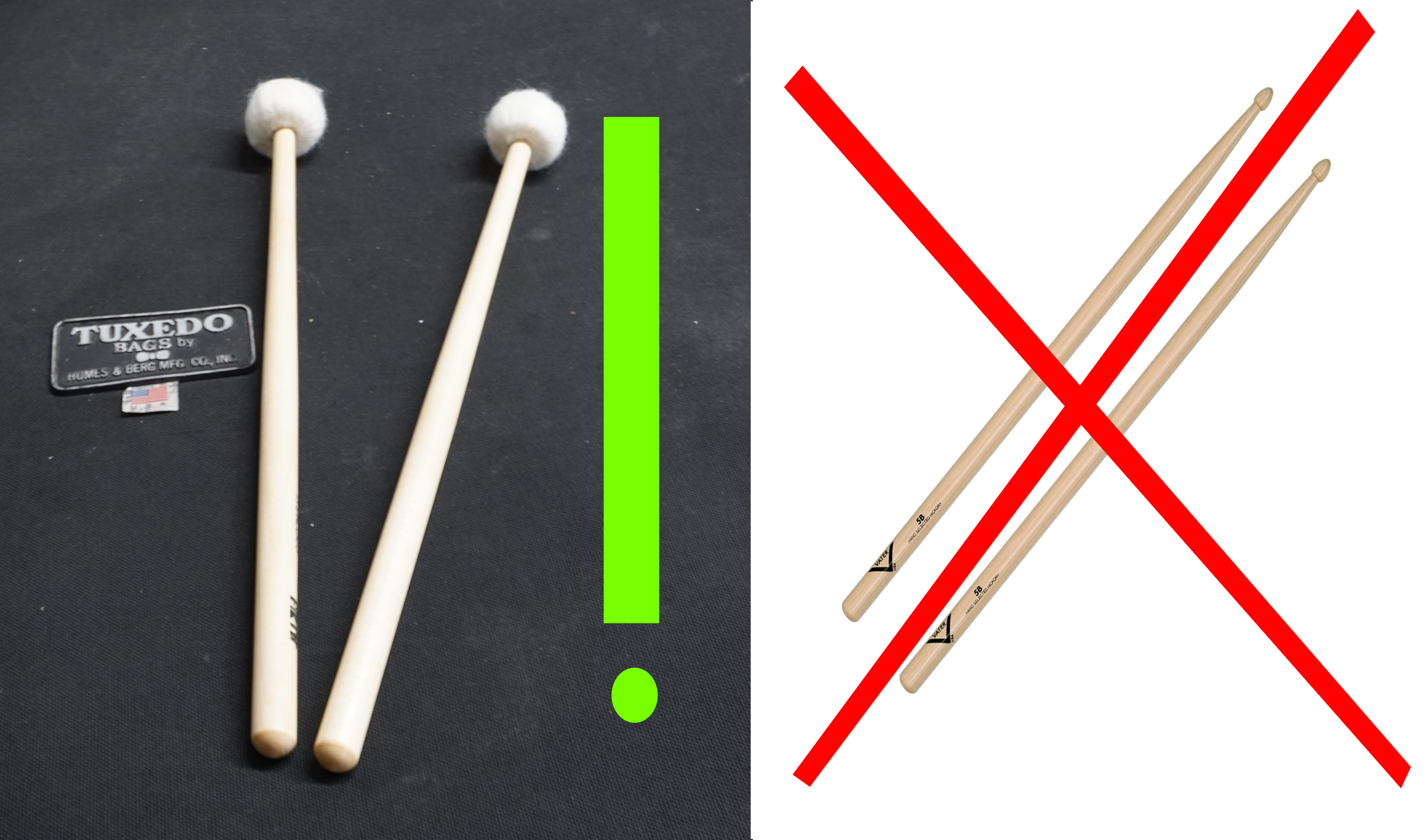 - Use the correct sticks. Timpani mallets are specially made for playing timpani. Do not use drum sticks, triangle beaters, marching bass drum sticks, or anything other than timpani mallets to play the timpani. This will avoid accidentally puncturing or otherwise damaging the heads.
